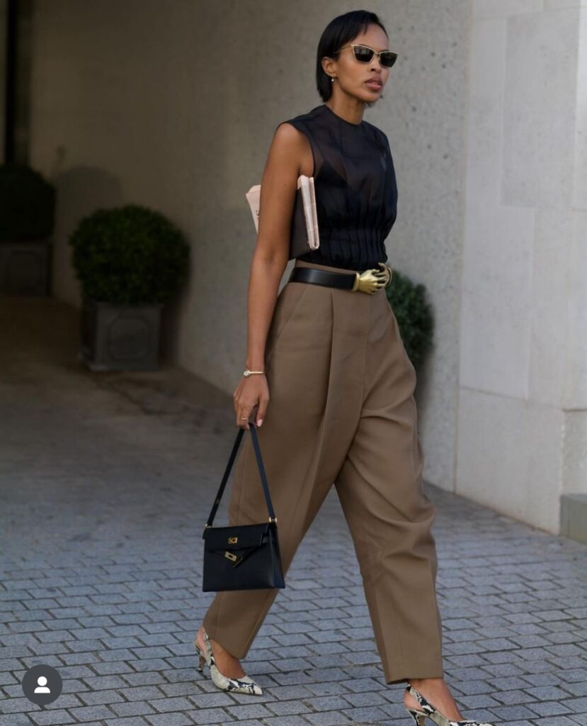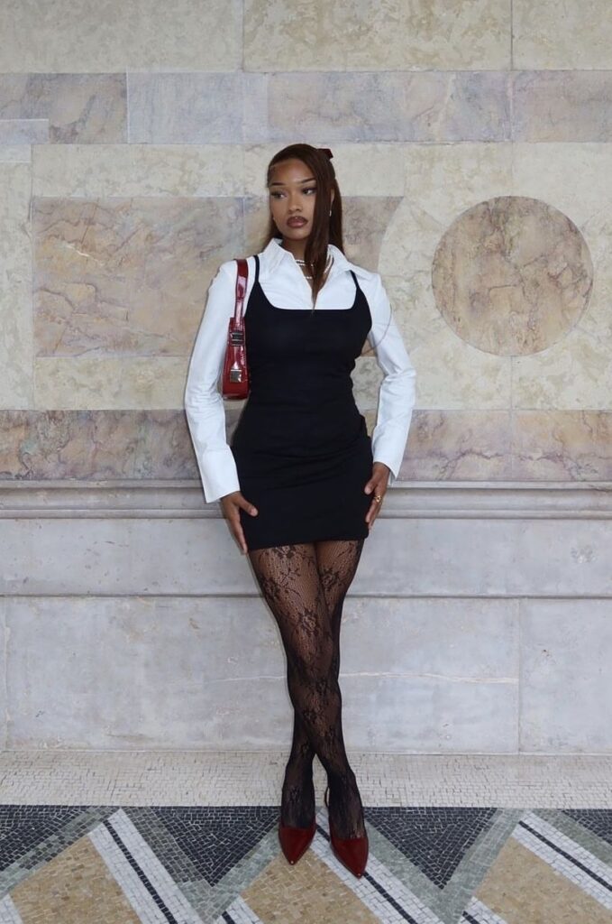 Think Lori Harvey, Zendaya, or Janelle Monáe on a press tour. It’s elevated basics, but with a little razzle dazzle.. A classic white button-down? Hers has puffed sleeves or an open back. She’ll give you cool-girl energy without trying too hard.