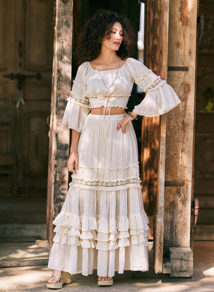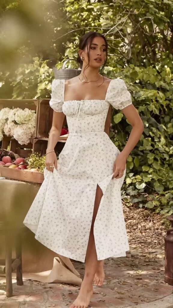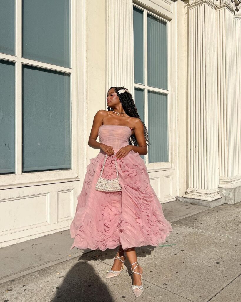 Her vibe is soft, delicate, and sweet, almost like she stepped out of a Jane Austen novel or a garden tea party. Tulle skirts, ruffles, lace, and soft pastel tones fill her wardrobe, and she’s the girl wearing a milkmaid dress while baking cupcakes or arranging peonies for fun.