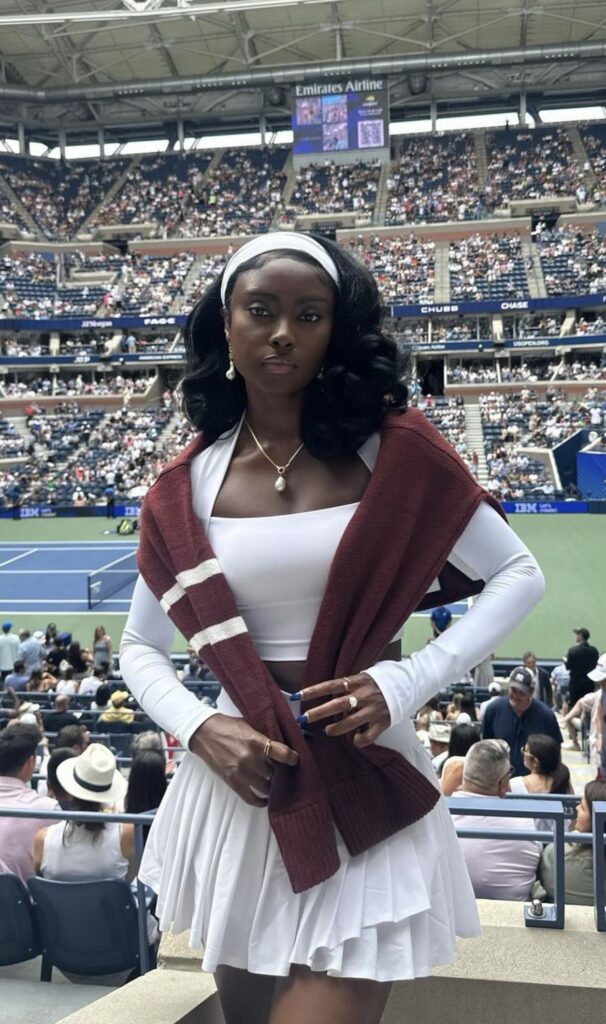 She’s not just wearing outfits; she’s serving full “Elle Woods meets Gossip Girl” energy. Headbands? Yes. A matching set? Always. She loves structure, symmetry, and looking like she actually reads Vogue.